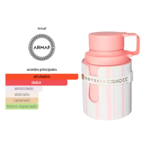 Odyssey Candee de Armaf es una fragancia de la familia olfativa para Mujeres. Esta fragrancia es nueva. Odyssey Candee se lanzó en 2024. Las Notas de Salida son fresa, frambuesa, geranio, bergamota y durazno (melocotón); las Notas de Corazón son caramelo, jazmín y maracuyá (fruta de la pasión); las Notas de Fondo son pachulí, almizcle y ámbar.